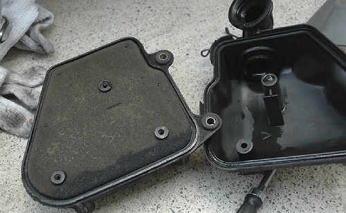 やや気絶しそうになりながら新品プラグを取り付け、予備がある事を「はっ」と思い出したエアフィルターの交換もします。 エアクリーナーボックスをキャブから外さなくてもできますが、クリップ一個にボルト2本だけなので ボックスを取り外してからやりました。 (YAMAHA車はアクシスに限らずヤマハ ジョグ(3KJ)(3YK)(3YJ) アプリオ(4JP)等全て似たような構造です) (↓ クリップ部/キャブとのジョイント) |